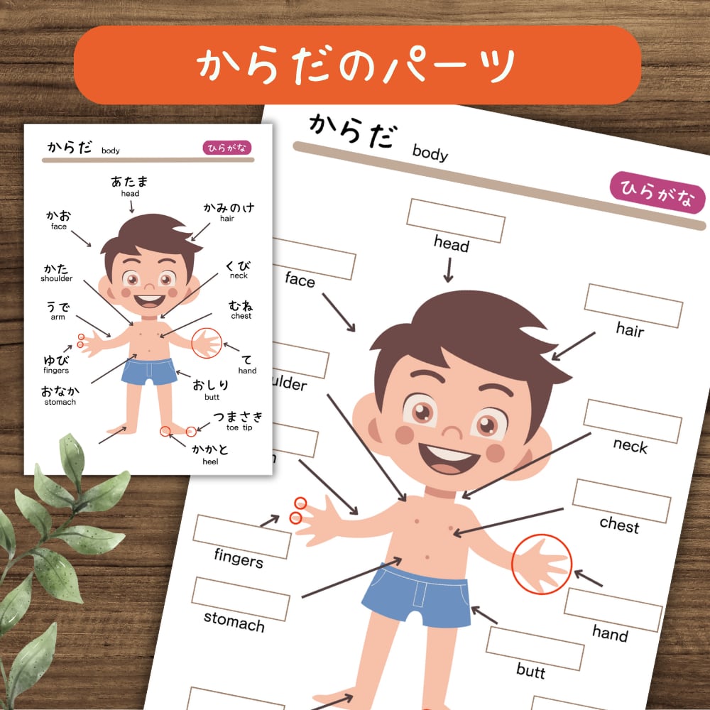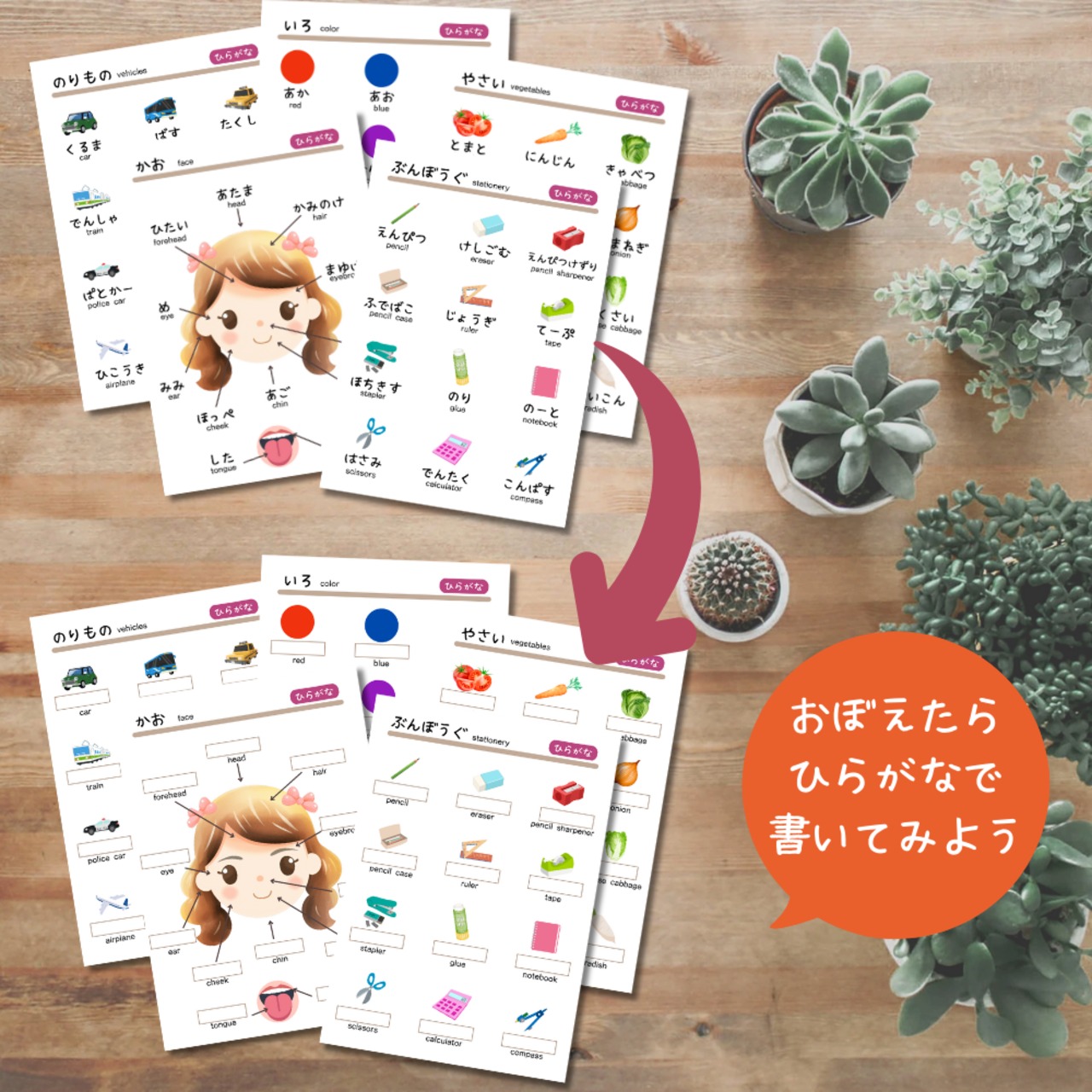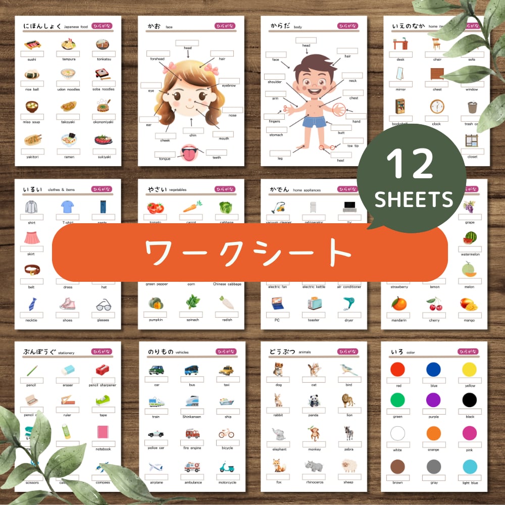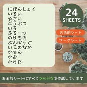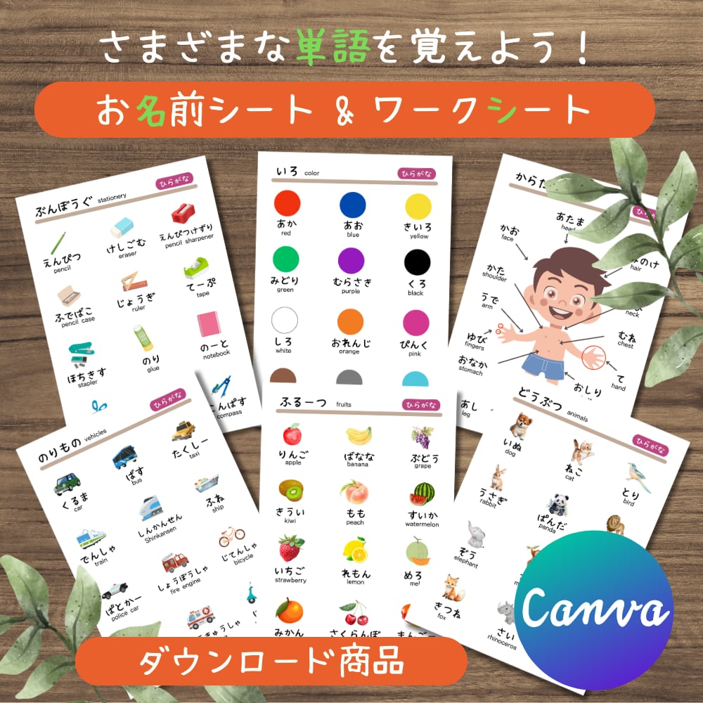 こちらは物の名前(単語)をひらがなで楽しく学習できるシートです。CANVAを使って自由にカスタマイズできるテンプレートで、全部で12個のトピックスに分かれています。それぞれ【お名前シート】と【ワークシート】がセットとなり、インプットとアウトプットで効率よく学習できるのが魅力です。