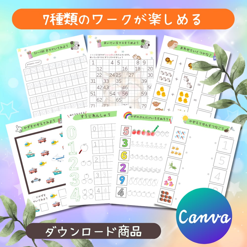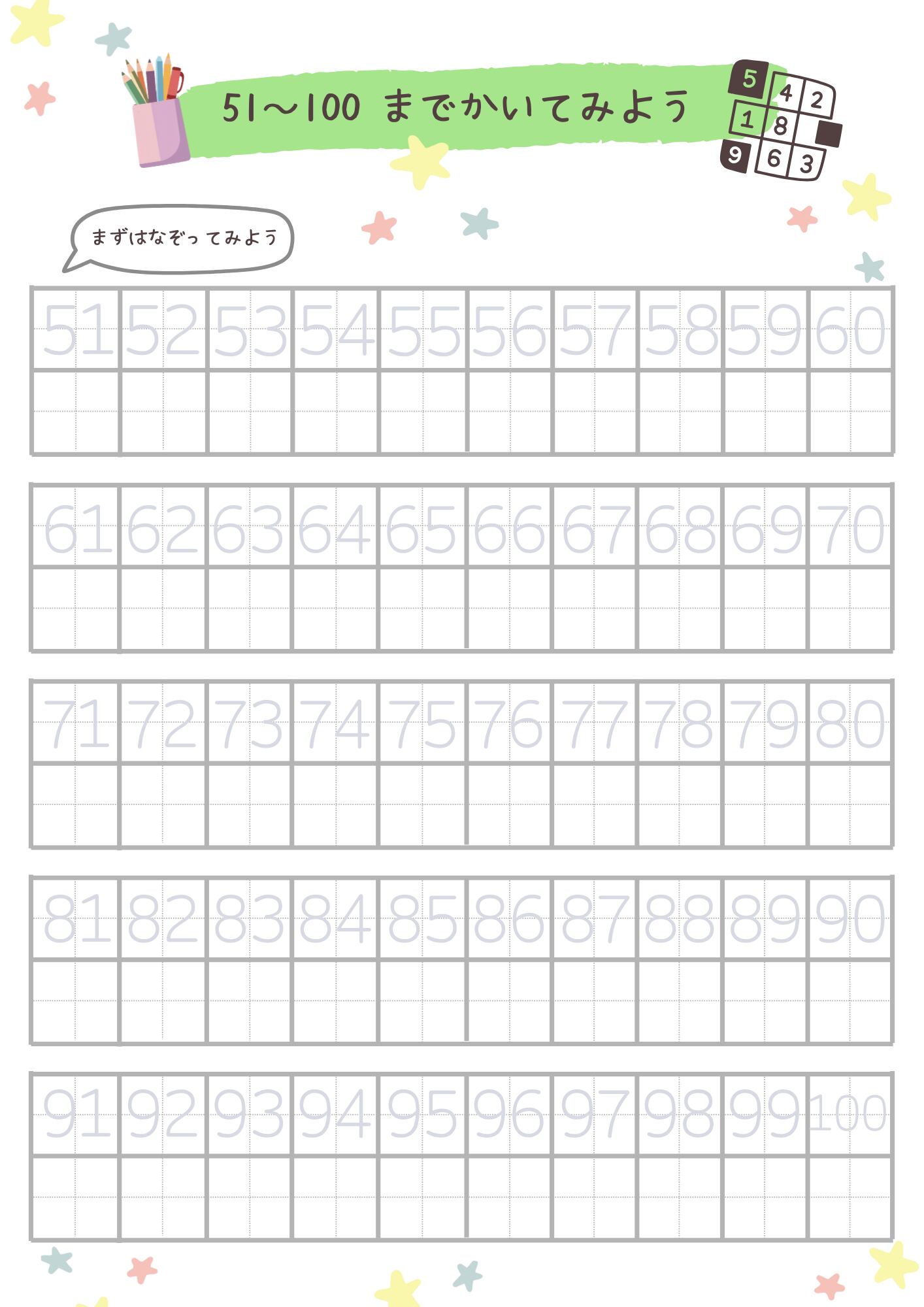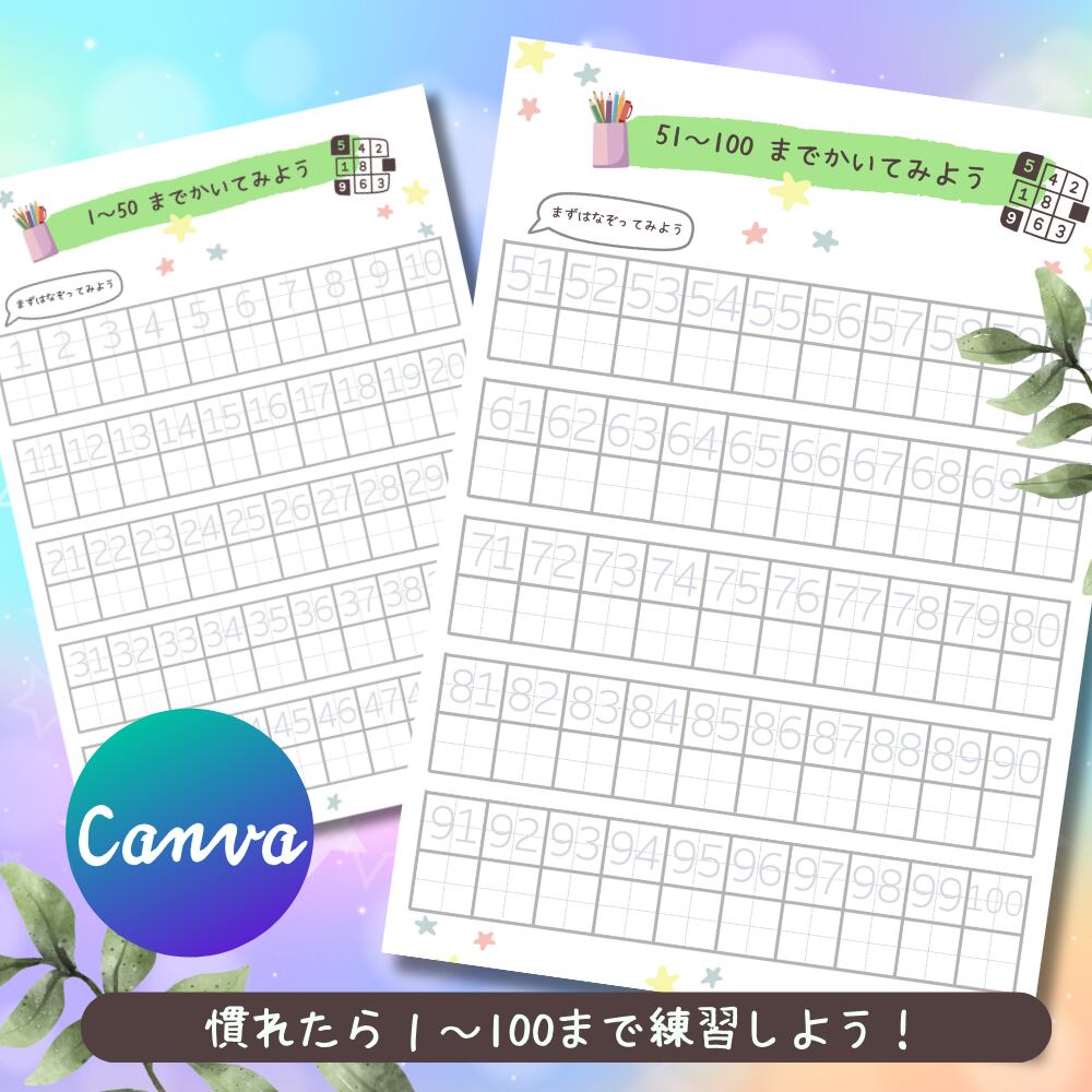 こちらは、1から100までの数字を楽しく学習できるキッズワークシートです。Canvaを使って自由にカスタマイズできるテンプレートになっているので、お子様の学びに合わせたデザインに編集も可能です。