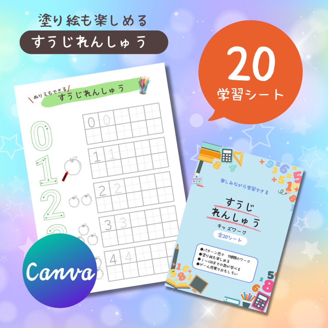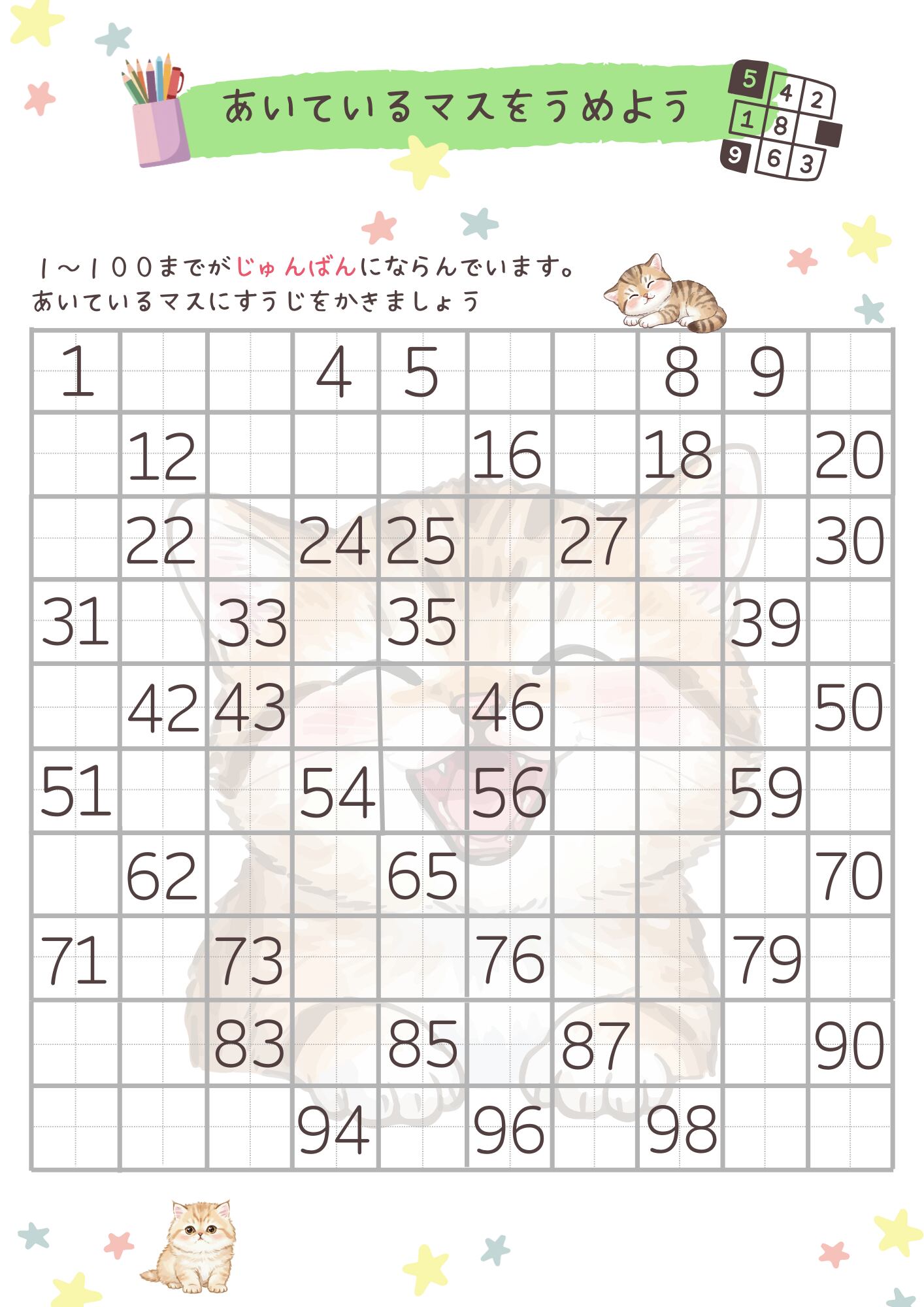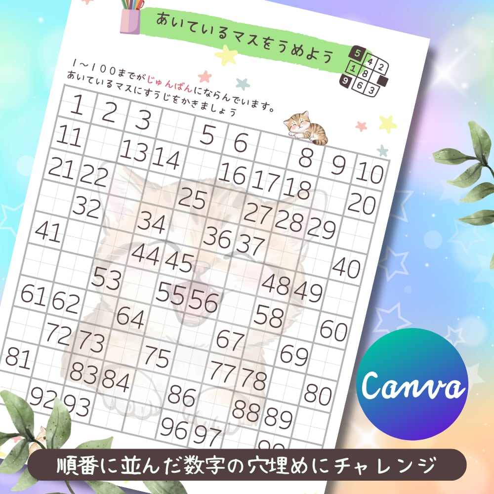 こちらは、1から100までの数字を楽しく学習できるキッズワークシートです。Canvaを使って自由にカスタマイズできるテンプレートになっているので、お子様の学びに合わせたデザインに編集も可能です。