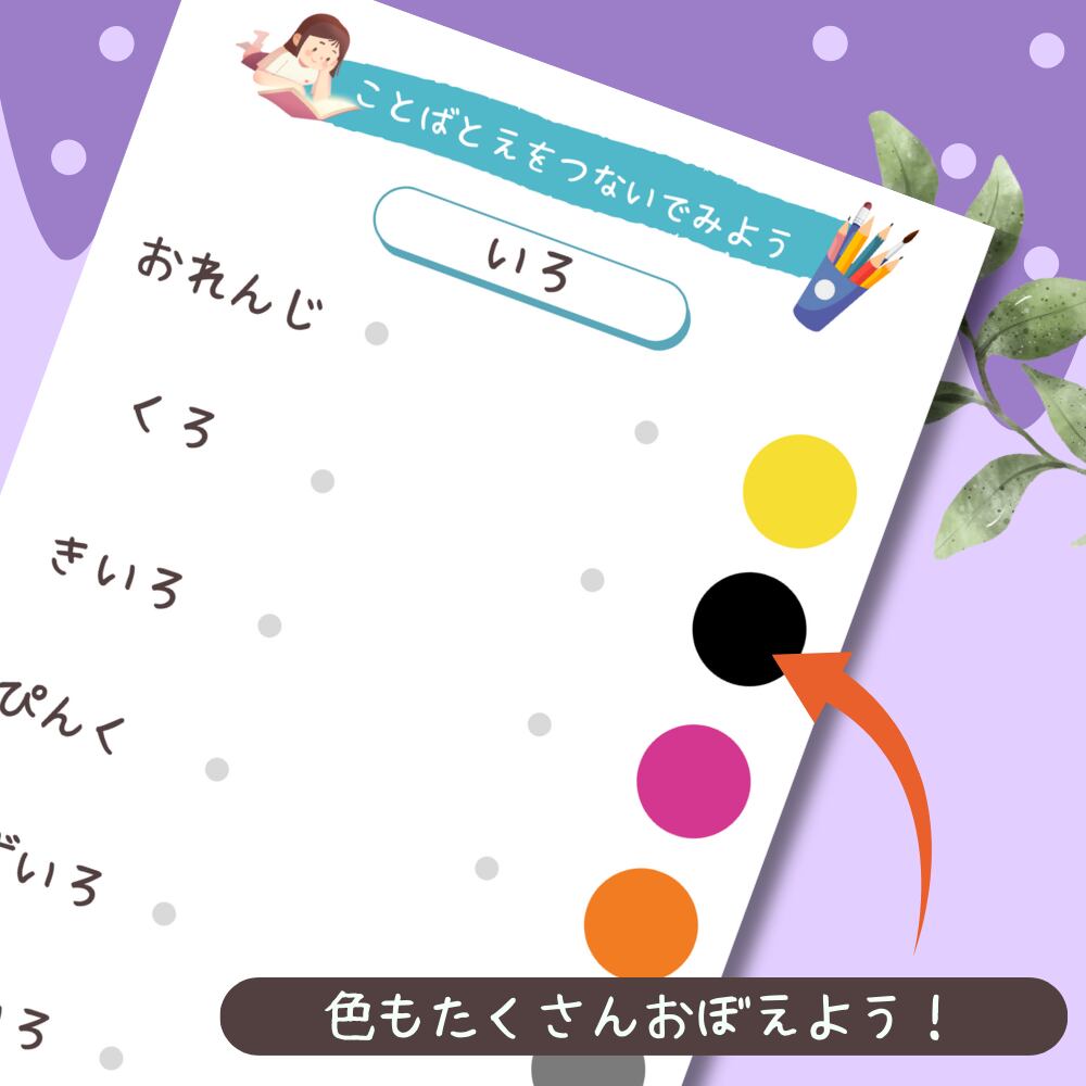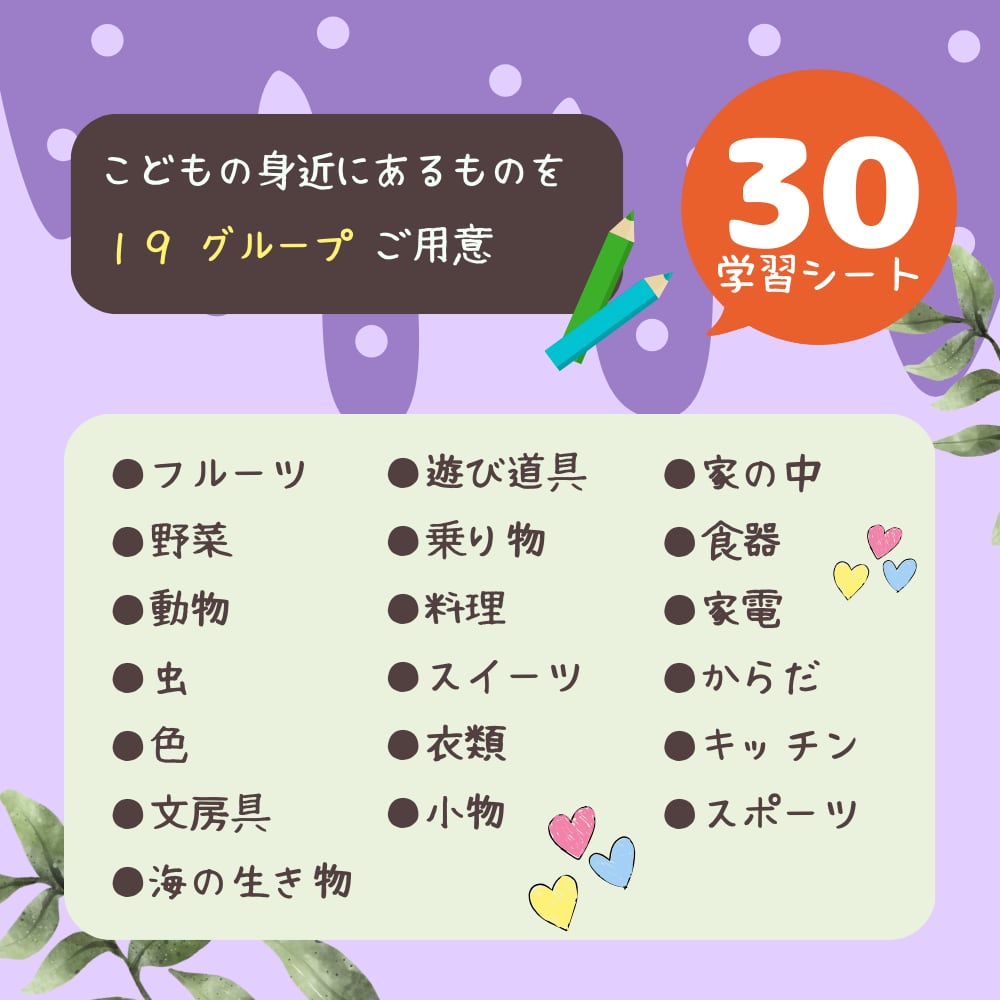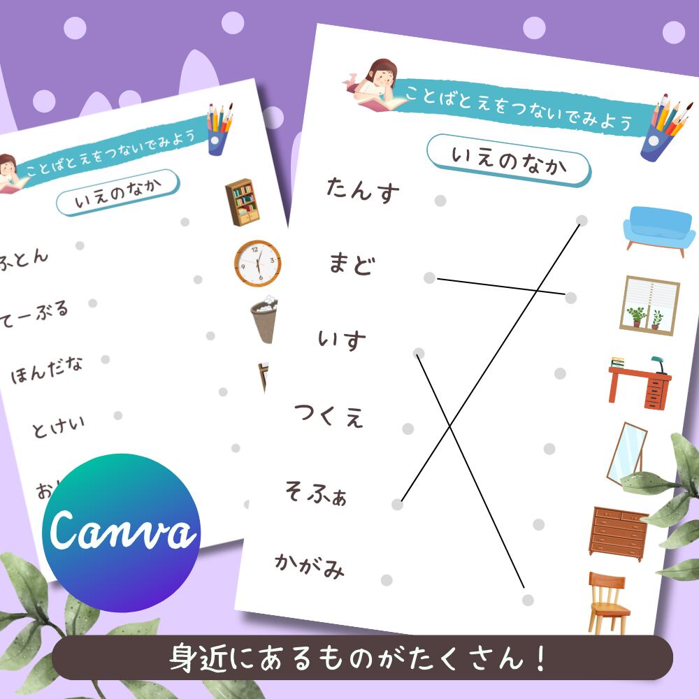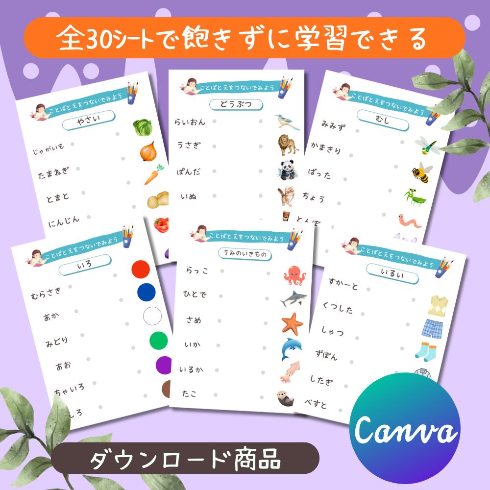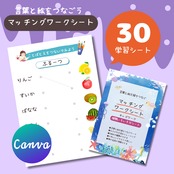 こちらは、言葉と絵を線でつないで楽しむマッチングワークシートひらがな編です。身近にあるものを19グループに分け全30シートをご用意。