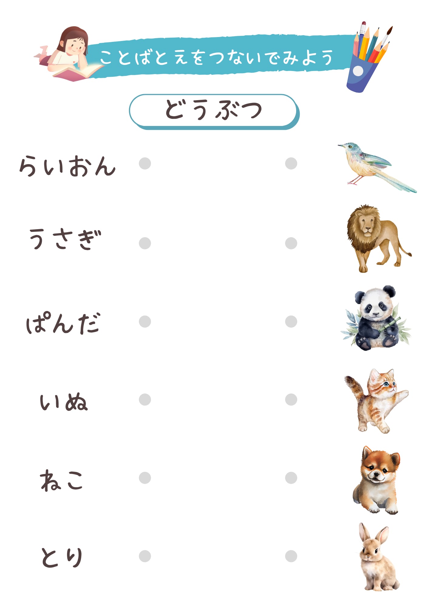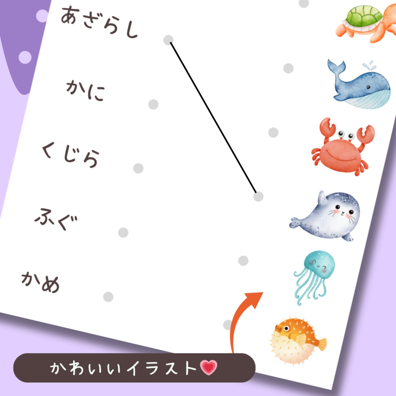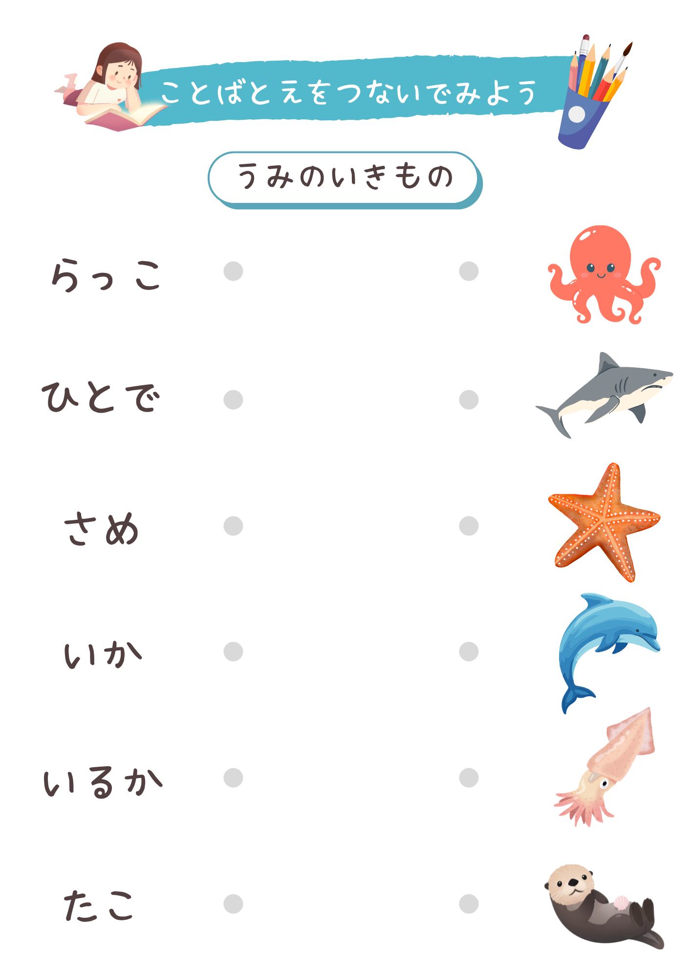 こちらは、言葉と絵を線でつないで楽しむマッチングワークシートひらがな編です。身近にあるものを19グループに分け全30シートをご用意。