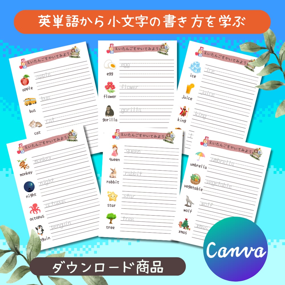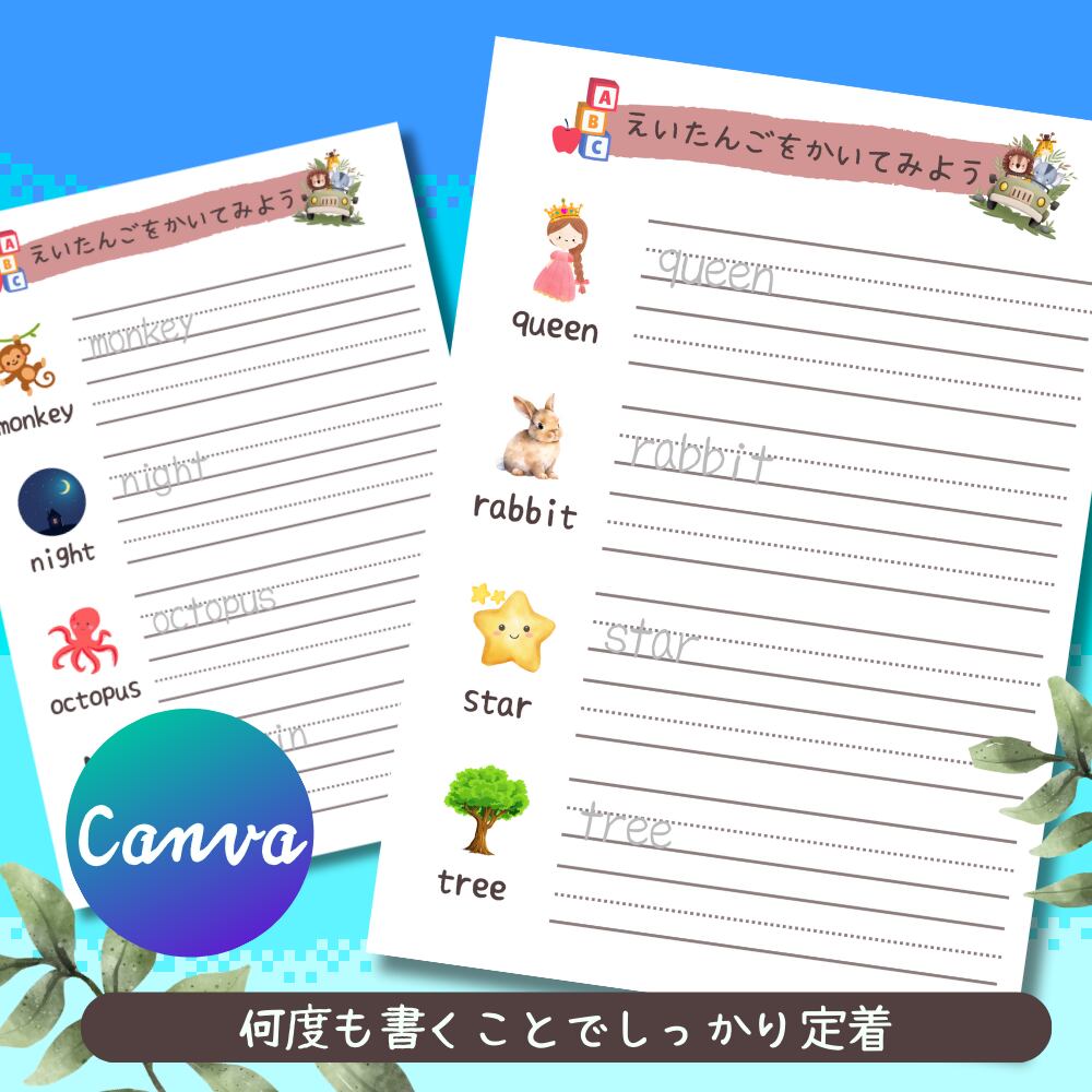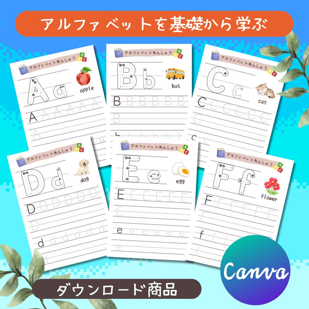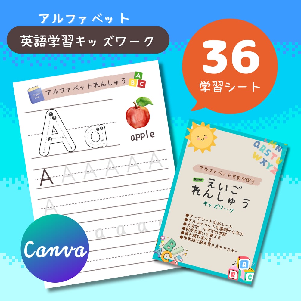こちらは、アルファベットの基礎を楽しく学べるキッズワークです。Canvaを使って自由にカスタマイズできるテンプレートになっているため、お子様の興味に合わせたデザインに編集することも可能です。
