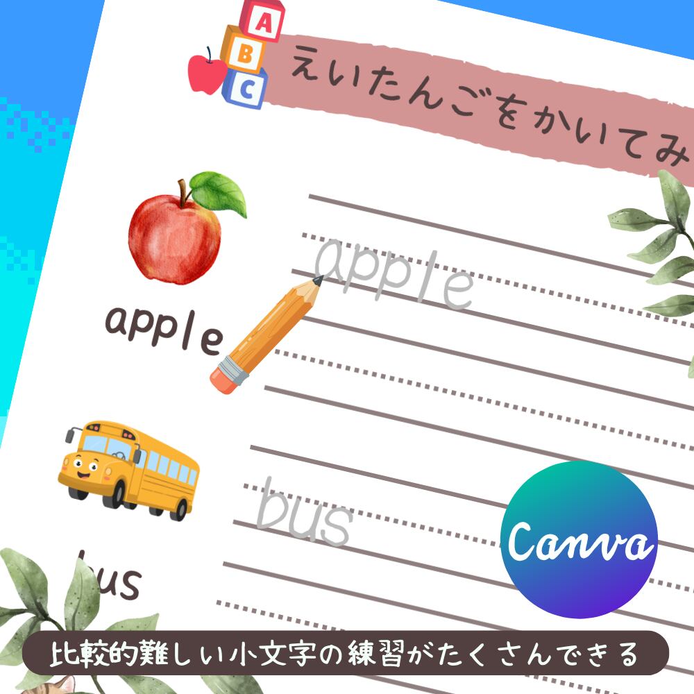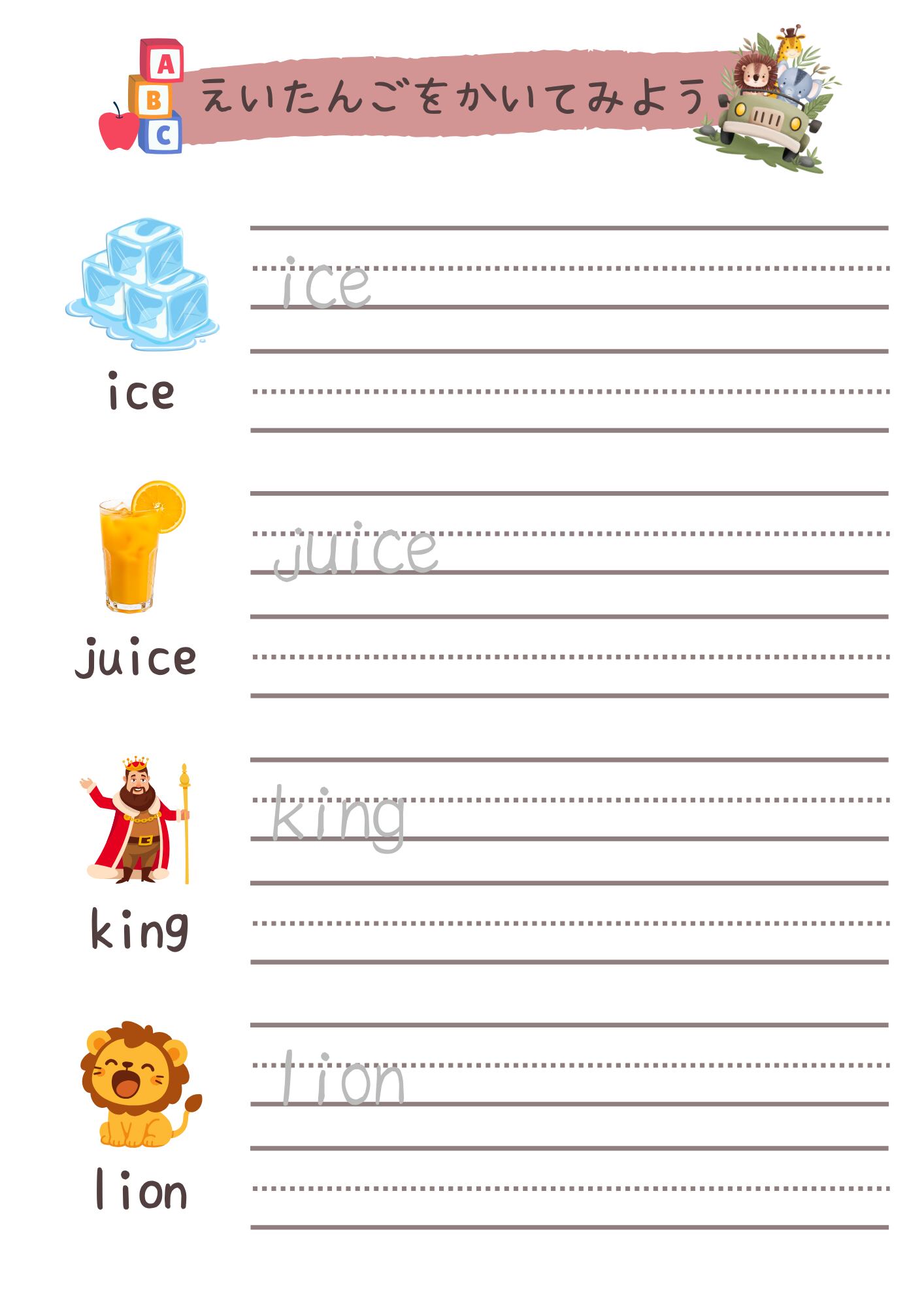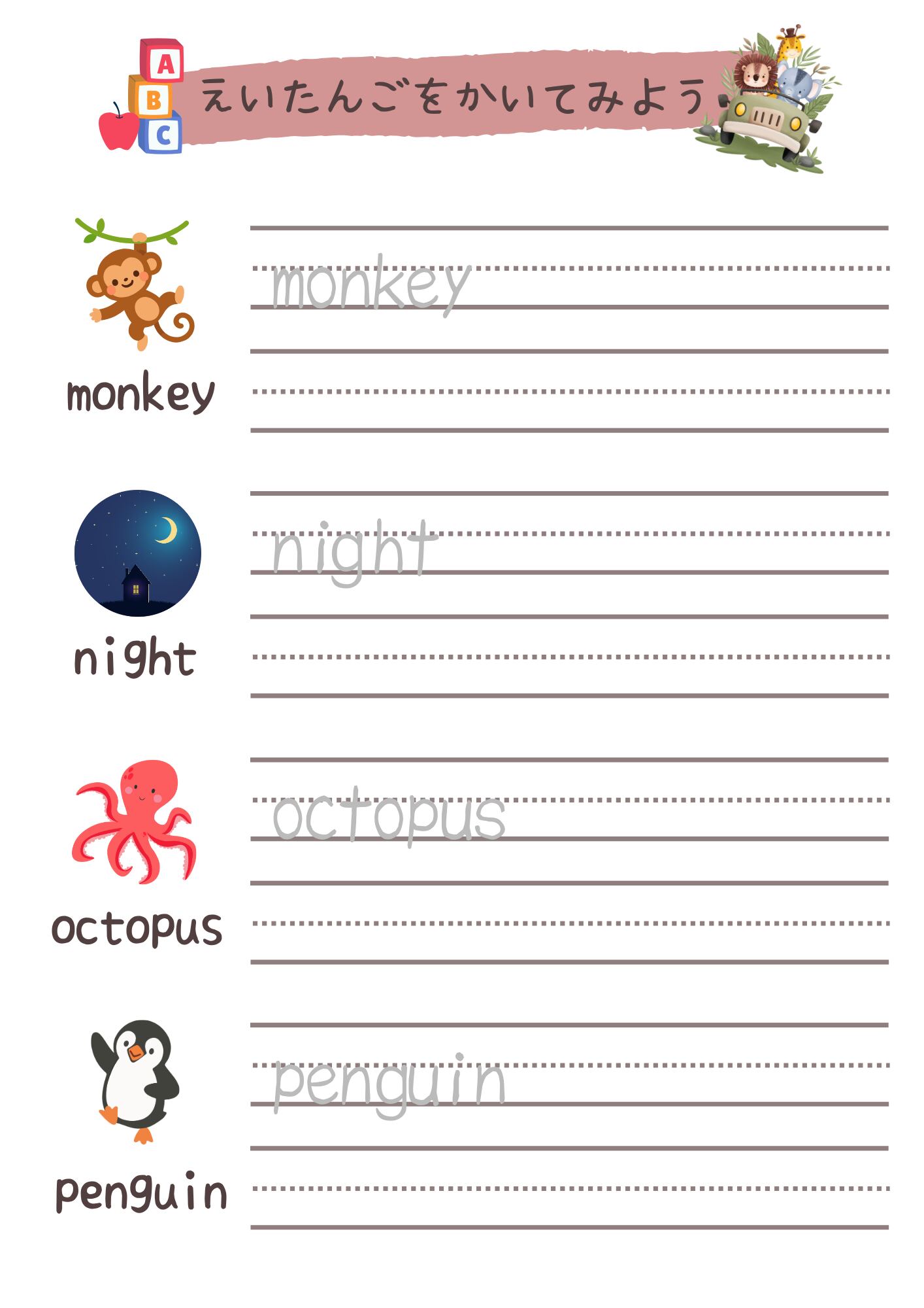 アルファベット1文字1文字の書き方をしっかり練習したら、比較的バランスの難しい小文字を、英単語通して何度も学習できます。